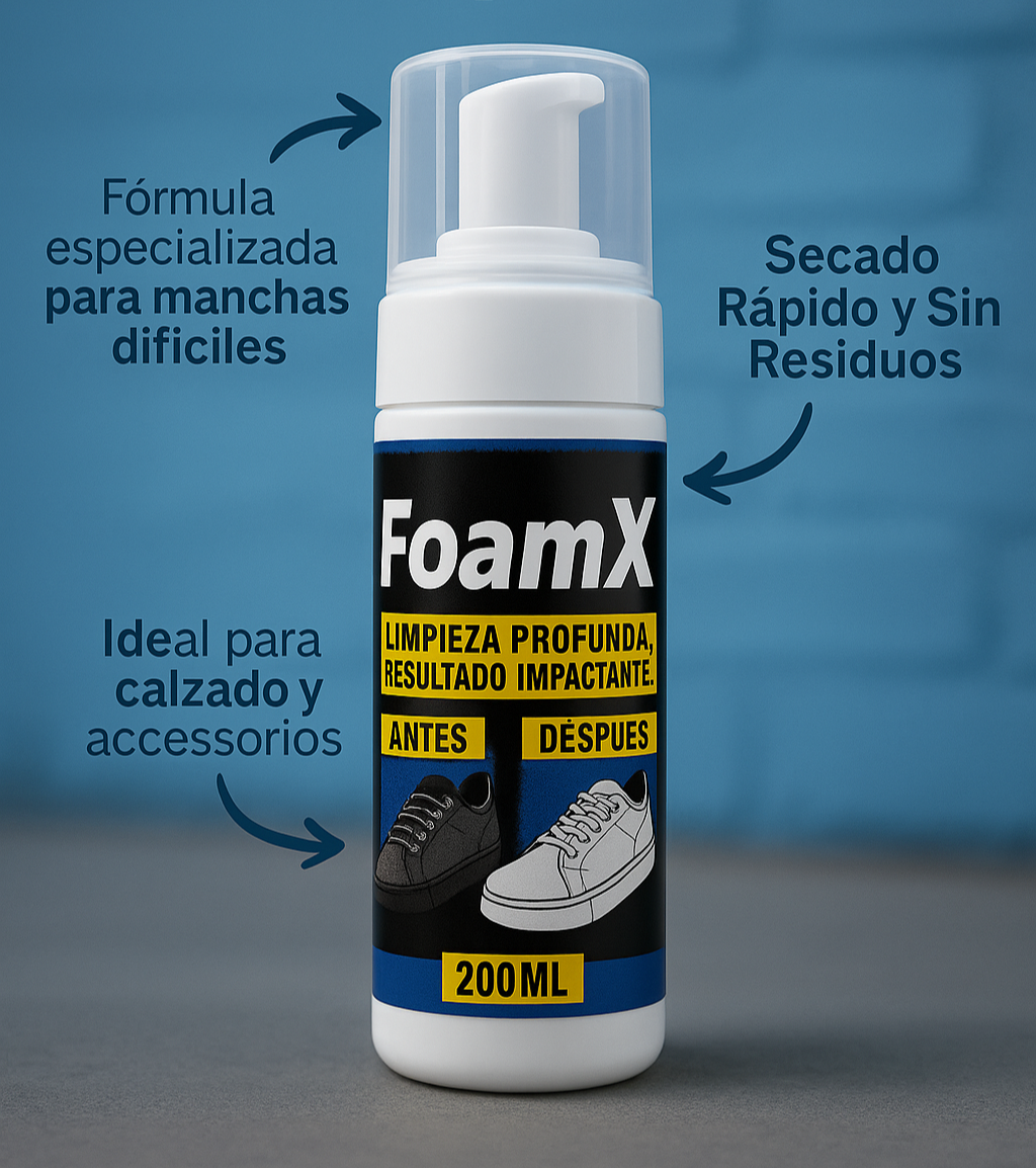 ✅ Espuma limpiadora FoamX (200 ml): Fórmula potente que remueve suciedad, manchas y grasa sin dañar los materiales. Ideal para cuero, tela, malla y más.